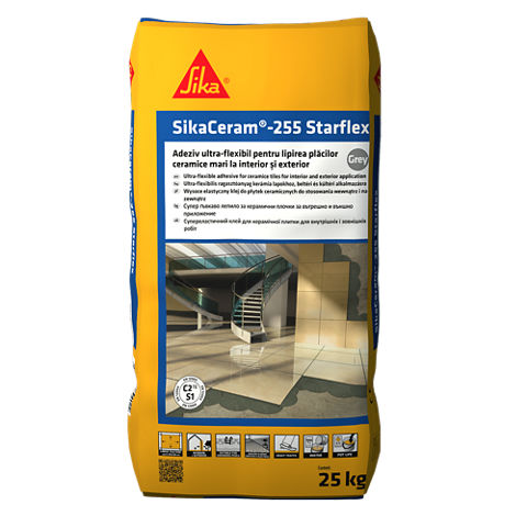 A SikaCeram®-255 StarFlex egykomponensű, cementbázisú, nagy szilárdságú ragasztó, mely válogatott szilikaport, kvarchomokot és adalékokat tartalmaz. A ragasztóréteg jól deformálható és 15 mm-es rétegvastagságig feldolgozható. felhasználáshoz csak vízzel kell összekeverni. Alkalmas porcelánlapok és természetes kőlapok ragasztására homlokzatokra, valamint kerámialapok ragasztására padlófűtésre, úszómedencékbe és ipari létesítményekben.