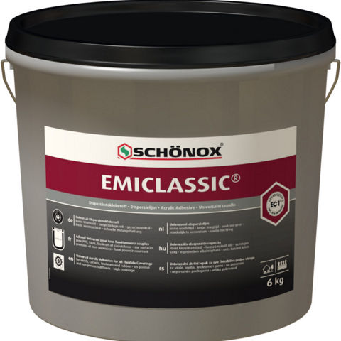 A SCHÖNOX EMICLASSIC univerzális, nyomás érzékeny diszperziós ragasztó minden rugalmas beltéri burkolathoz. Alkalmas PVC és CV fal- és padlóbur-kolatokhoz, normál-, PVC- és PU hátoldalú szőnyegekhez, linóleum- és gumi burkolatokhoz, valamint SCHÖNOX hangszigetelő lemezek ragasztásához nedvszívó és nem nedvszívó alapfelületen beltérben.