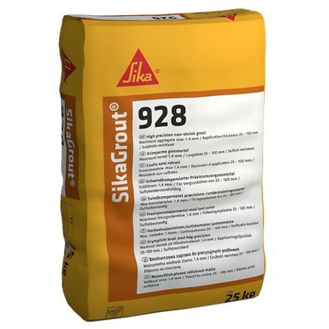 A SikaGrout®-928 egykomponensű, zsugorodásmentes, nagy szilárdságú, cementbázisú precíziós kiöntőhabarcs. Vízzel összekeverve a SikaGrout®-928 folyékony konzisztenciájú habarcsot képez, mely könnyen feldolgozható kézzel vagy szivattyúberendezéssel. A SikaGrout®-928 kiváló terülési tulajdonságokkal rendelkezik, osztályozódás és kivérzés nélkül.