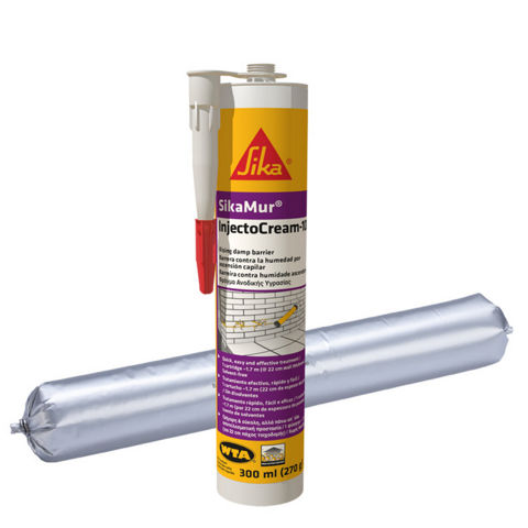 A SikaMur® InjectoCream-100 egy új megoldás a felszálló nedvesség szabályozására. A SikaMur® InjectoCream-100 egy vízlepergető krém, 600 ml-es monoporciós vagy 300 ml-es kartus kiszerelésben. A falazat habarcsrétegébe fúrt lyukakba kell bejuttatni egy egyszerű kinyomó pisztoly segítségével - nincs szükség speciális injektáló berendezésre. Miután a habarcsrétegbe injektálták, a SikaMur® InjectoCream-100 felszívódik a nedves falban, ahol vízzáró réteget képez, hagyja a falat kiszáradni és gátolja a későbbi felszálló nedvességet.